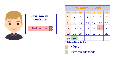 Foi constatado que não será possível realizar a rescisão do colaborador Rafael Santana, pois o mesmo encontra-se de férias no dia 20/09/2019. Dessa forma o presidente da empresa deverá aguardar o período de férias do colaborador Rafael Santana encerrar, para dar continuidade no processo de rescisão.