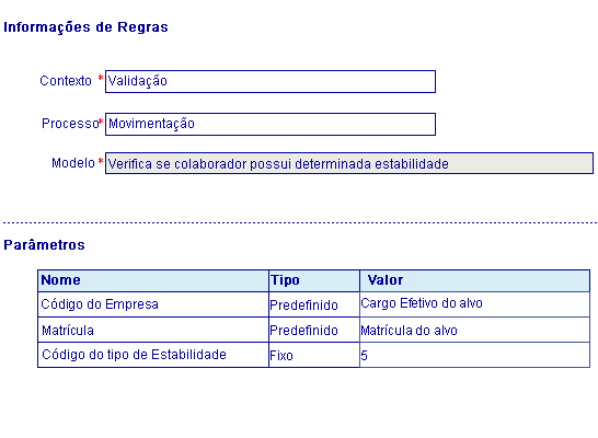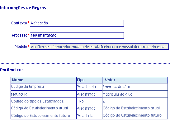Através deste modelo é possível Verificar se o colaborador mudou de estabelecimento e possui determinada estabilidade do tipo informado, preenchendo os campos Código do tipo de estabilidade, Código do estabelecimento atual e Código do estabelecimento futuro.