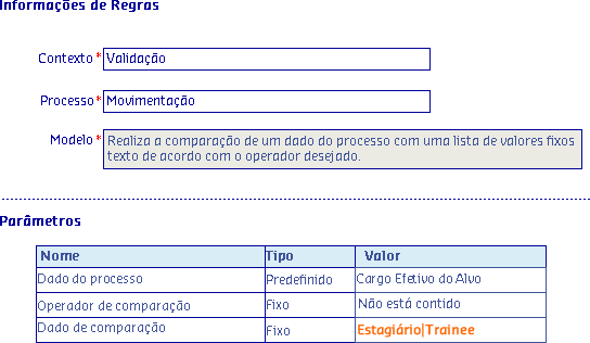Para isso, é possível criar uma regra utilizando o modelo Realiza a comparação de um dado do processo com uma lista de valores fixos texto de acordo com o operador desejado, tomando apenas os colaboradores que não possuem os termos Estagiário ou Trainee na denominação de seu cargo.