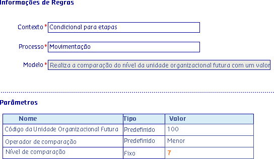Através deste modelo é possível realizar a comparação do nível da unidade organizacional futura informando de forma predefinida o operador de comparação desejado e também a forma predefinida (Maior, Maior ou igual, Menor, Menor ou igual, igual, diferente) e um valor numérico indicando o nível de comparação, de forma fixa.