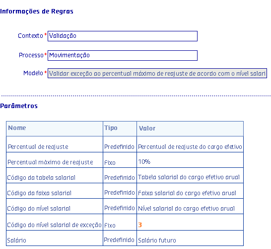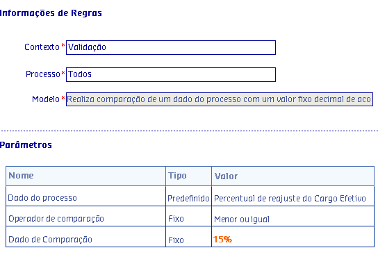 Existem situações onde a empresa concede reajuste salariais aos seus colaboradores por mérito. Nesses casos podem existir um percentual máximo permitido para esse tipo de reajuste. Portanto, para atendimento desse cenário é possível criar uma regra utilizando o modelo Realiza a comparação de um dado do processo com um valor fixo decimal de acordo com o operador desejado para verificar se o percentual de reajuste salarial concedido ao colaborador está dentro do limite estipulado.