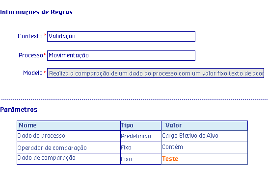 O gestor da área de desenvolvimento, decidiu aumentar o quadro de colaboradores para analista de teste da sua unidade organizacional. Durante o processo de Requisição de Pessoal para aumento de quadro, ao informar o cargo analista de teste a regra Realiza a comparação de um dado do processo com um valor fixo texto de acordo com o operador verifica para quais unidades organizacionais é permitido a admissão de colaboradores para analista teste.