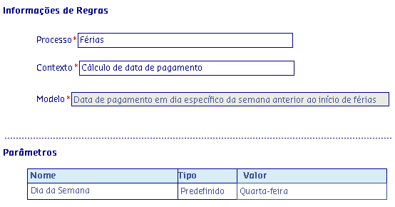 Através deste modelo é possível realizar configuração de férias permitindo informar o dia da semana em que será realizado o pagamento das férias. Essa regra será apresentada somente para o processo de Férias e contexto Cálculo de data de pagamento.
