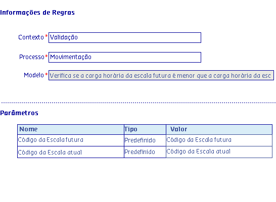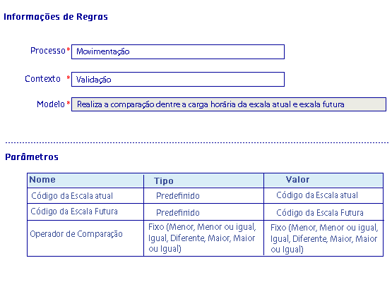 Através desse modelo, a regra retornará verdadeiro quando o resultado da comparação entre a carga horária da escala atual e a carga horária da escala futura for satisfeita, de acordo com o operador desejado.