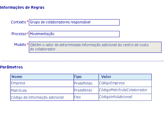 Através deste modelo é possível obter a informação adicional selecionada do centro de custo do colaborador. Essa regra será apresentada para o contexto Grupo de colaboradores responsável.