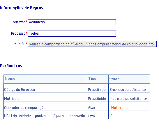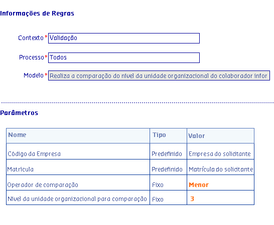 Através do modelo Realiza a comparação do nível da unidade organizacional do colaborador informado de acordo com o operador, é possível restringir quem poderá fazer solicitação a depender do Nível da Unidade Organizacional em que o solicitante se encontra.