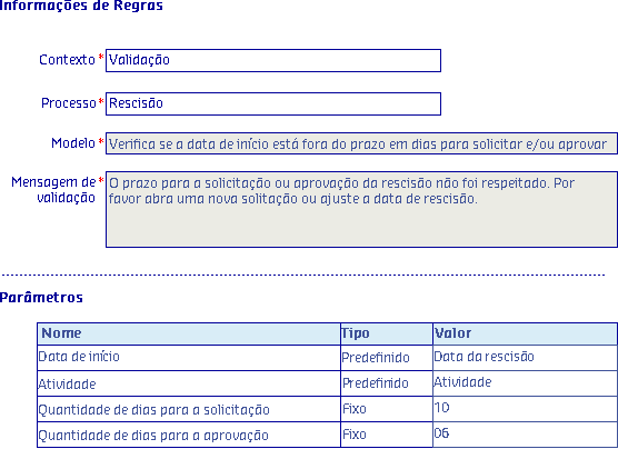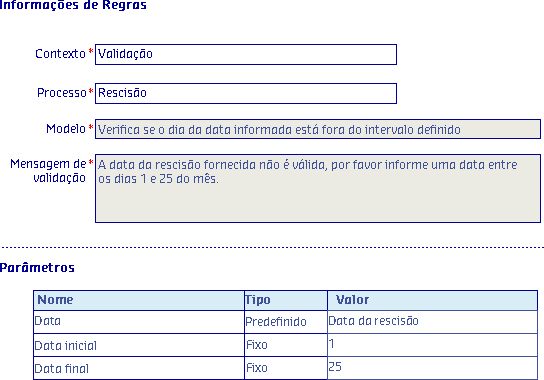 Caso a regra não seja cumprida, será apresentada em tela a mensagem cadastrada na própria regra.
