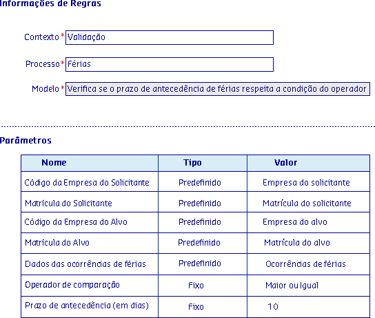 Para que ela consiga prosseguir com a solicitação o prazo de antecedência deverá ser diferente do que está cadastrado na regra Verifica se o prazo de antecedência de férias respeita a condição do operado e valor fixo, caso o solicitante seja igual ao alvo, conforme parametrização abaixo: