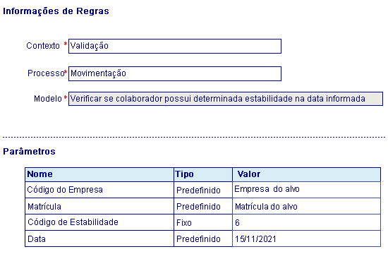 O colaborador Henry possui uma estabilidade de retorno de férias (representado pelo código 6) no período de 01/11/2021 a 30/11/2021. Foi realizada a parametrização utilizando o modelo de regra Verificar se o colaborador possui determinada estabilidade na data informada da seguinte forma: