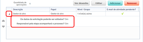 Ao selecionar as opções Grupo de colaboradores ou Pessoas do grupo de colaboradores, é apresentada a opção Impedir que o Alvo do processo realize a aprovação, caso ele participe do grupo de colaboradores responsável?. A opção quando marcada como Sim, permite ao sistema impedir que o solicitante, caso este faça parte do grupo de colaboradores do processo, aprove sua própria solicitação. Caso a opção esteja marcada como Não, permite ao solicitante realizar a aprovação da etapa.