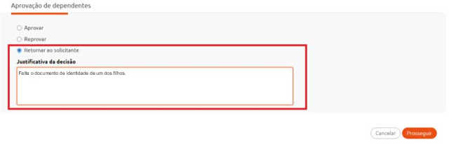 A equipe de RH responsável pela análise e aprovação da documentação de Dependentes notou a falta do documento. Como no Processo Parametrizável de Dependentes o indicador Disponibilizar opção para retornar o processo ao solicitante? estava marcado, foi possível para o RH retornar ao solicitante o processo ao marcar a opção Retornar ao Solicitante, permitindo assim que o colaborador anexasse os documentos faltantes.