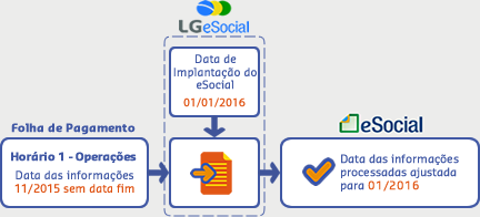 O registro do Horário 1 - Operações foi cadastrado na Folha de Pagamento e processado em 11/2015, sendo que a data de implantação do eSocial é 01/01/2016. Como a data do processamento é inferior à data de implantação, a data de vigência das informações processadas foi ajustada para 01/2016 conforme data de implantação: