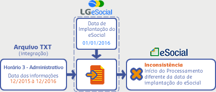 O registro do Horário 3 - Administrativo foi informado através de arquivo de integração (.txt) e processado em 12/2015, sendo que a data de implantação do eSocial é 01/01/2016. Como a data de início é anterior a data de implantação, neste caso é gerada uma inconsistência, e por ser um arquivo externo, esta informação não poderá ser reprocessada.